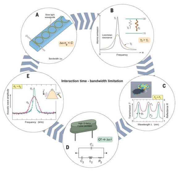 這個(ge) 規律是由K. S. Johnson在1914年提出的:諧振腔要麽(me) 儲(chu) 能時間較長,而帶寬窄;要麽(me) 帶寬較大,但儲(chu) 能時間短。在諧振腔內(nei) 長時間存儲(chu) 大數據是不可能的。因為(wei) 長時間意味著帶寬窄,反之亦然。這種時間帶寬極限規律提出之後的一百多年來,從(cong) 來沒有被挑戰過。物理學家和工程師一直據此來設計和構建光學、聲學、電子諧振係統(見圖1)。從(cong) 前沿的微納/慢光波導、到原子/分子結構中的振動關(guan) 係、所有類型的諧振腔、晶體(ti) 振蕩器等等被時間帶寬極限所限製。