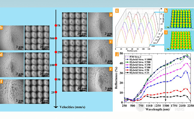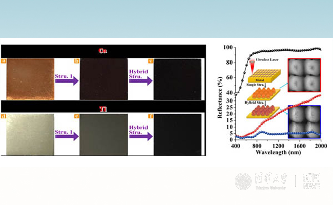 該成果提出了一種基於超快激光脈衝注入調控的金屬表麵微米-納米雙尺度複合結構雙級調控製備新方法,通過對超快激光加工過程中脈衝注入數量和注入方式的靈巧控製,實現了對微米尺度結構和納米尺度結構的分別有效調控,從而可以同時發揮微米尺度結構的幾何陷光效應和納米尺度結構的等效介質效應,最終達到優異的高效抗反射性能。這是利用超快激光在可控微納米製備方麵取得的最新研究進展。該方法對於銅(Cu)、鈦(Ti)、鎢(W)等多種金屬均有效,可在其表麵分別獲得1.4%,0.29%,2.5%的已知最低金屬表麵反射率,是一種在金屬表麵可控構建微納米複合功能結構的通用方法。
