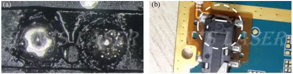 基於(yu) 激光能量高度集中,錫膏受熱不均爆裂飛濺,濺落的錫珠易造成短路(如圖2(a)),因此對錫膏的質量要求非常高,可采用防飛濺錫膏以避免飛濺(如圖2(b))。