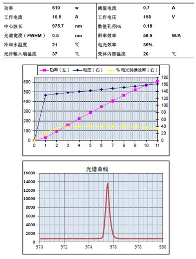 由於(yu) 采用單管串聯、空間合束的技術路線,在600瓦的輸出條件下,該產(chan) 品輸出光纖的數值孔徑(90%能量)僅(jin) 為(wei) 0.18。通過對芯片與(yu) VBG的優(you) 化組合,在整個(ge) 工作電流調節範圍內(nei) ,該產(chan) 品均能實現波長鎖定,光譜寬度小於(yu) 1nm。0.18的輸出NA,使得光纖激光器在合束器熔接點的壓力大幅降低。整個(ge) 工作電流範圍內(nei) 的鎖定,保證了在設備啟動和調製過程中,半導體(ti) 激光器泵浦源的中心波長保持不變,產(chan) 品也不受環境溫度的影響,為(wei) 應用帶來了諸多優(you) 勢。