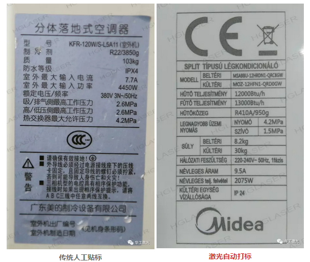 美的集團與華工激光展開深度合作,運用當下最先進的激光打標技術對“空調標簽產品線”進行自動化改造,將原有塑料標簽整體換成激光標記,加工方式由傳統的人工貼標改為激光自動打碼,提高生產效率的同時,也更加環保。
