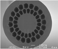 更為(wei) 神奇的是,光子晶體(ti) 光纖還有一神奇的“變種”。如果去除光子晶體(ti) 光纖的實心纖芯,換成“空心”就形成了類似於(yu) 宇宙“蟲洞”的時光隧道,大大減小了光纖傳(chuan) 輸的非線性效應、色散和損耗,可用於(yu) 大功率激光傳(chuan) 輸、新型通信及光纖傳(chuan) 感,圖4是一種空心帶隙型光子晶體(ti) 光纖。