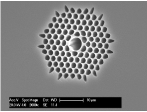 光子晶體光纖的結構與常規光纖迥然不同,普通的光纖是由實體的纖芯和包層構成的,而光子晶體光纖的包層由空氣孔和石英構成,空氣孔在纖芯的外圍以正六邊形的樣子規則排列。石英-空氣複合結構的光子晶體光纖大折射率反差、高度可控製的周期性折射率變化,為光的傳導與控製提供了新的機理及途徑。光子晶體光纖具有許多獨特而神奇的物理特性:可控的非線性、無盡單模特性、可調節的奇異色散、低彎曲損耗、大模場等,這些特性是常規石英單模光纖很難或無法實現的,因此,光子晶體光纖引起了科學工作者的濃厚興趣,並開展了深入的理論與試驗研究。