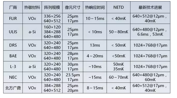 國內外主要廠商的技術對比情況如表所示。從表中可以看出,目前國內外產品的幾項主要技術指標中,熱敏材料、陣列規模、熱響應時間、NETD等基本居於同一水平,在像元尺寸方麵國外廠商具有一定領先優勢。