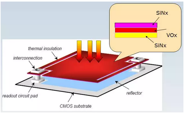 熱敏層材料的選取對於微測輻射熱計的靈敏度(NETD)有非常大的影響,目前最為常用的熱敏材料包括氧化釩(VOx)和多晶矽(a-Si)兩類,相應的非製冷紅外焦平麵探測器也據此分成了兩大技術陣營。