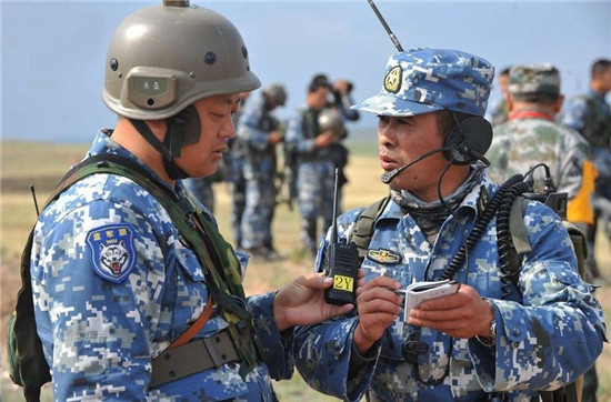 藍軍(jun) 在進行戰術部署。可以看見藍軍(jun) 頭戴的“單兵激光模擬交戰係統”。