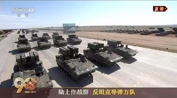 據中國兵器工業集團公司官微報道,作為陸軍裝備研製的主體和三軍裝備研製的骨幹力量,兵器工業集團的99A主戰坦克、04A履帶式步兵戰車、08式輪式裝甲步戰車、122毫米自行加榴炮、155毫米自行炮、遠程火箭炮、紅箭10、空降車、北奔重汽底盤等25型現役裝備成功受閱。