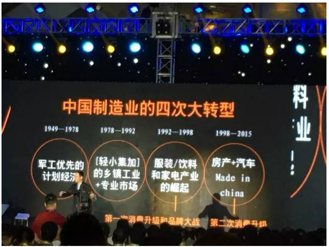 92年以後中國商品開始發展,老百姓手裏有點錢,所以我們要改善他們的生活。怎麽辦呢?讓他們吃好穿好,所以服裝、飲料行業開始起來,還有保健品。當我們吃好穿好以後怎麽辦?我們家裏夏天的時候最好有一個空調、大冰箱,89年以後開始有電視機,家電企業起來了。中國的服裝品牌,中國的飲料品牌,中國的家電,你想的起來的,這三各行業的品牌,90%以上成名在1992-1998年之間,這就是中國的第二次轉型。