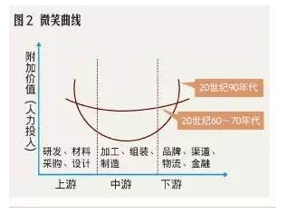 1992年,台灣企業家施振榮提出了“微笑曲線”(Smile Curve)理論。微笑曲線認為,曲線左右兩側附加價值高,利潤空間大;而處在曲線中間弧底位置的加工、組裝、製造等,技術含量不高,附加價值低,利潤微薄。中國產業界對“微笑曲線”奉為經典並因此陷入迷惘。在這一思想指導下,中國製造業轉型升級的方向必須向所謂的價值鏈高端延伸,特別是走品牌化的道路。而麵向零售市場和品牌之路是“敗九成一”的策略,風險極大,並非適用所有製造業企業。
