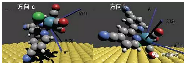 圖4 由 HD 2D SFG 和 IRRAS(紅外反射吸收光譜)測量法得到的金表麵上靶向催化劑的方向,使用 DFT(密度泛函理論)模擬。方向 a 是較佳方案。藍棒代表振動模式方向。