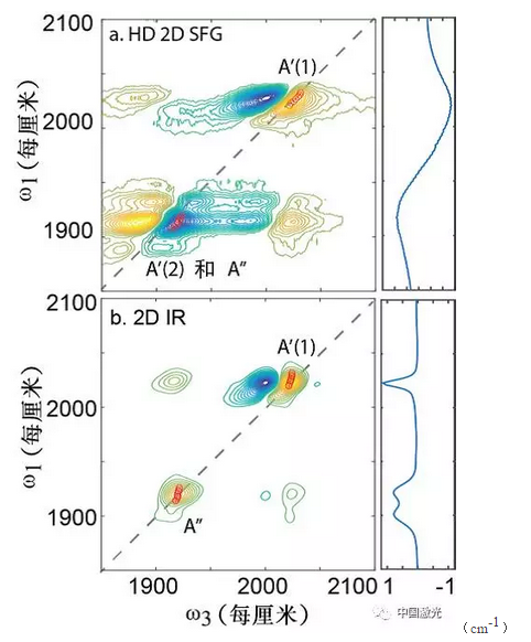 另一項重要成果是峰的線形和中心線斜率(圖 3 中的虛線)與 A″ 和 A′(2)的振動相關。數據表明,A′(2) 和 A″ 模式距離表麵更近,再結合 HD 2D SFG 圖上峰的標記,熊教授實驗室確定了兩種可能的分子方向。