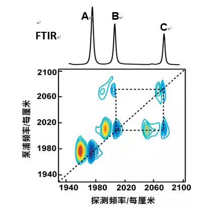 圖1 實驗測得混合化合物的傅裏葉紅外光譜(FTIR)(上)和 二維紅外光譜(2D-IR)(下)。通過 FTIR ,無法確定混合物中包含多少種分子,對應 FTIR 中的每個峰值,2D- IR會呈現一對對角峰。2D- IR 光譜中的交錯峰顯示頻率較高的兩個峰(B 和 C)彼此耦合,表明它們屬於相同分子。A則來自樣品中的其他分子。