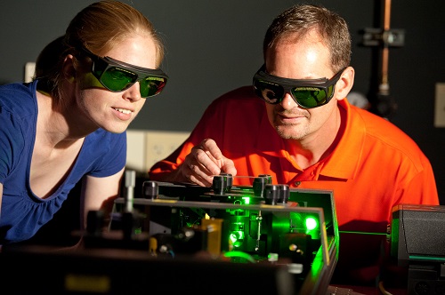 John Ballato教授和他的學生正在調整用於(yu) 該研究的激光器。照片來源:John Ballato/美國克萊姆森大學(Clemson University)。