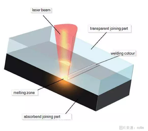 塑料激光焊接要求焊接材料一方具有激光透過性,另一方則具有吸收性,稱為透過式塑料激光焊接。對於吸收性不足的材料,通常采用添加吸收劑(碳黑)的方式。隻是碳黑也能吸收可見光,容易造成焊縫顏色變深,與母材顏色不同。英國焊接學會(TWI,The Welding Institute)已研製出對可見光透明的染料,可解決此問題。