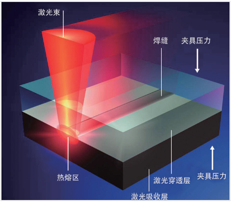 激光束通過上層透光材料,然後被下層材料吸收,激光能量被吸收後轉換為熱能,由於兩層材料被壓在一起。熱能從吸收層傳導到透光層上,使得兩層材料熔化並結合。