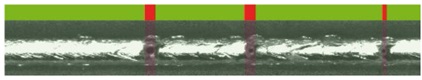 激光釺焊縫在白車身生產中經常用作風格元素。在上漆之後,它們對於最終用戶是直接可見的,使得焊縫表麵的氣孔是不可接受的焊縫缺陷。因此,檢測這些焊縫缺陷是非常重要的。由於大部分氣孔在表麵上是開口的,它們會在明亮的照明焊縫上成為黑點。例如通過斑點檢測,這樣的黑點似乎是顯而易見的。但這種方法並不能令人滿意,因為其取決於閾值和實際照明情況。更理想的一種方法是使用基於分類的氣孔檢測,如[2]所示。專門的圖像特征被用於將固化焊縫分類為有缺陷或無缺陷的部分。強度的平均值和標準偏差以及梯度圖像用於分類。通過FPGA技術,對有缺陷和無缺陷的部分的修整值進行比較,從而可以在實時配置中判斷焊縫質量。可以使用這種方法檢測直徑從幾百微米到幾毫米的氣孔。結果在全景圖像中是可見的,如圖4所示;氣孔被標記為紅色,而焊縫的無缺陷部分被標記為綠色。