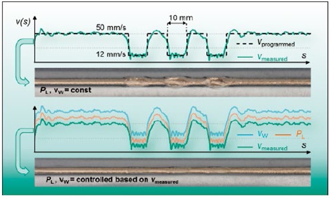在激光釺焊的情況下,激光功率PL以及填充焊絲的速度vW需要根據測量的速度按比例調整[5]。受控激光釺焊的結果如圖5所示。該係統在工藝條件下通過對法蘭接頭結構的釺焊進行了測試。在實驗中,速度在3至0.72米/分鍾的範圍內變化。盡管該變化範圍很大,受控釺焊過程仍然保持穩定,並且引導機器人係統的速度波動得到補償。此外,焊縫表麵實現了平滑而且幾乎均勻的光學外觀。人們(men) 可以想到的一個(ge) 相關(guan) 應用是行李箱蓋的焊接,其中由於(yu) 工件的幾何形狀,釺焊過程中激光頭需要重新對準,在光學器件繞著銘牌的突出部分的邊緣轉動時,釺焊速度會(hui) 下降到較低值。