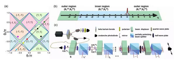 為了研究宇稱-時間對稱的量子世界中的物理現象,我們需要一個由宇稱-時間對稱的量子理論控製的量子係統。能否利用量子光源例如單光子或者糾纏光子對來實現宇稱-時間對稱呢?由於量子特性,量子光源實現強度(即光子數)增益麵臨著巨大的挑戰,因此這樣的非厄米性量子係統是否存在呢?為了回答這一問題,薛鵬教授團隊設計了開放係統中loss-no loss量子行走模型,以行走者的幾率交替損耗-不損耗的方式取代難以實現的損耗-增益,證明其同樣滿足宇稱-時間對稱性。並利用單光子在線性光學體係中實現了宇稱-時間對稱的量子行走,分別演示了宇稱-時間對稱性保持、破缺以及臨界點的量子特性。首次實現了真正意義上的宇稱-時間對稱的量子係統的動力學演化過程。