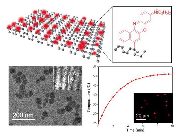 圖釋:熒光分子Nile Blue修飾的黑磷示意圖(上圖)、微觀結構(下圖左),以及光熱效果和熒光成像效果(下圖右)