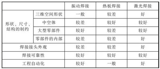 目前已有多種塑料焊接方法,如:超聲波焊接、摩擦焊接、振動焊接、熱板焊接,各種焊接方法適合不同尺寸、形狀的焊接部件,優劣比較見下圖。
