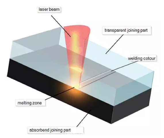 塑料激光焊接要求焊接材料一方具有激光透過性,另一方則具有吸收性,稱為透過式塑料激光焊接。對於吸收性不足的材料,通常采用添加吸收劑(碳黑)的方式。隻是碳黑也能吸收可見光,容易造成焊縫顏色變深,與母材顏色不同。英國焊接學會(TWI,The Welding Institute)已研製出對可見光透明的染料,可解決此問題。