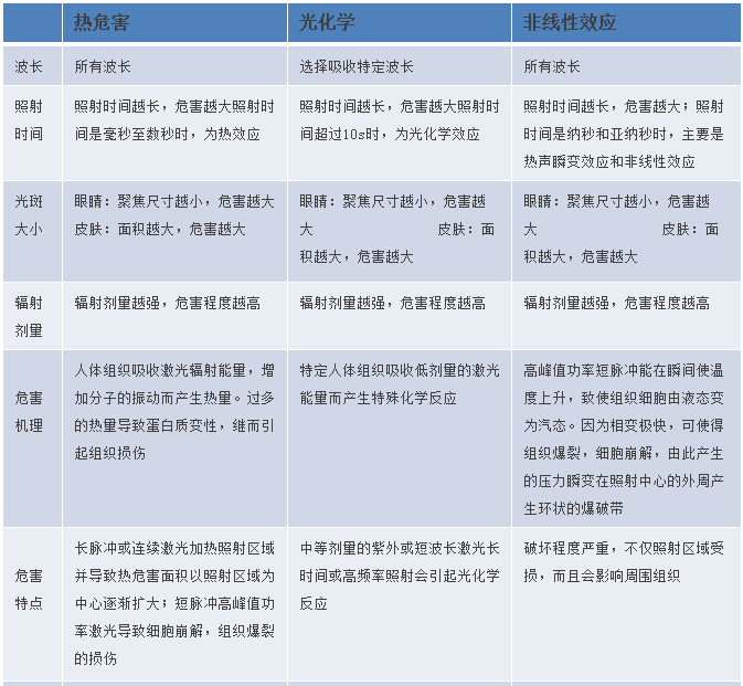 激光輻射對人體組織的危害機理包括熱危害、熱聲瞬變和光化學危害和非線性效應。激光的危害是一個複雜的過程,通常是一種或者幾種危害的共同作用。危害的部位和程度取決於激光輻射的參數,其中最重要的是波長、脈寬、聚焦尺寸、輻照劑量、輻射時間。激光對人體的危害匯總如下: