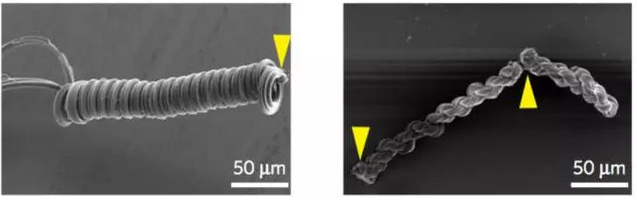 至於(yu) 處於(yu) 這兩(liang) 條線之間的激光,其功率則可以成功的讓蜘蛛絲(si) 半融化,體(ti) 積稍微擴大一圈;在照射偏離中心的位置時,還能讓蜘蛛絲(si) 進行彎曲。通過對照射時間的控製,研究人員們(men) 可以精準控製彎曲的具體(ti) 度數。目前,他們(men) 已經用蜘蛛絲(si) 成功做出了螺線管、彈簧、以及複雜的結扣。