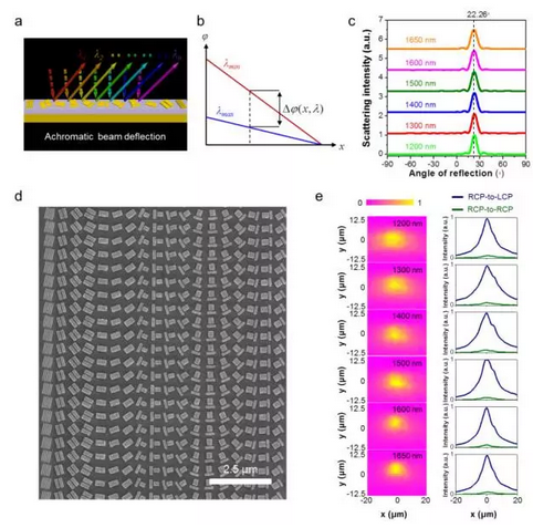 圖5 (a)連續寬帶消色差超構表麵反射板示意圖;(b)不同頻率相位差示意圖;(c)理論計算各種頻率下消色差樣品的反射角度;(d)實驗製備消色差反射板的SEM圖;(e)實驗測試得到的反射效果