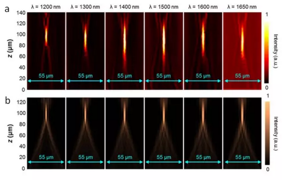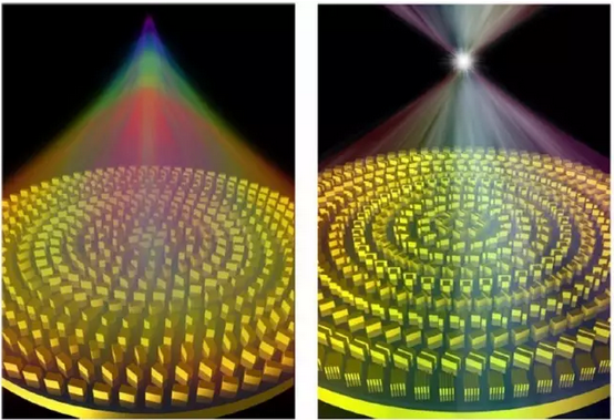 目前,人們已經展示了利用超構表麵研製的平板超構透鏡(百納米量級厚度)可以媲美傳統光學顯微鏡鏡頭的成像效果。不過,此類新原理設計真正走向應用還麵臨幾項重要挑戰,材料色散及衍射效應導致的色差就是其中之一。