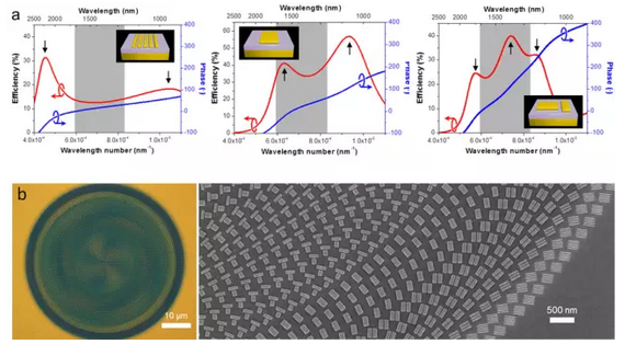 需要特別強調的是,通常的共振帶來相位變化都是突變的,不滿足與頻率成正比的線性相位補償。本工作中,他們提出了新穎的“集成共振”(integrated resonance)方案,通過特殊排列的金屬棒的多個共振之間的線性相位區域,成功設計出滿足聚焦透鏡要求的一係列不同斜率的線性相位補償的結構單元(見圖3a)。圖3b顯示了利用納米加工製備的反射性超構透鏡樣品照片,整個鏡片的直徑約55 μm。右側電子顯微鏡照片反映出了該超構透鏡的結構單元具有幾何相位的旋轉排布,以及不同納米棒形狀及數目的集成共振性質。