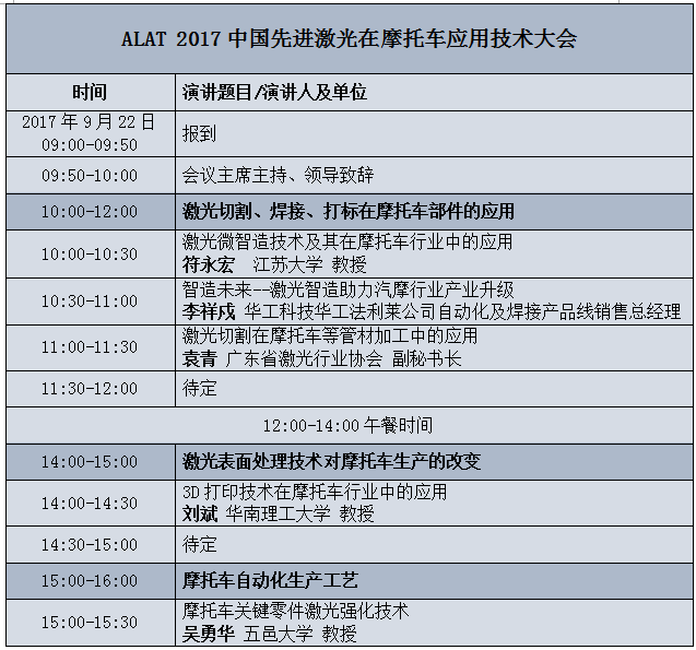 本次大會(hui) 將邀請國內(nei) 摩托車研究單位、知名生產(chan) 企業(ye) 、高校院所、專(zhuan) 家學者、生產(chan) 技木骨幹和激光加工技術在摩托車應用方麵的領軍(jun) 人物參加,圍繞“激光智造”核心主題,探討當前國內(nei) 激光在摩托車應用技術的前沿技術及熱點問題,介紹相關(guan) 領域最新技術發展狀況,促進國內(nei) 前沿技術的交流和發展。