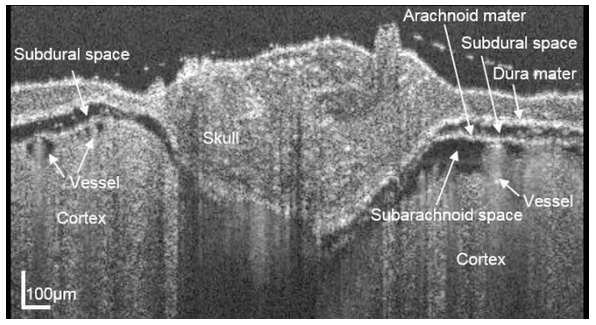 圖. 用光學相幹斷層(OCT)觀察活體鼠腦在頭蓋骨磨薄處理後,硬膜下腔(subdural space)的打開現象。(圖片來自:Woo June Choi & Ruikang K. Wang, Chinese Optics Letters 15 (9), 090005 (2017). )