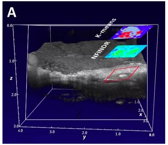 除此之外,光學相幹斷層成像(OCT)領域在近期也有新的進展。例如,來自愛爾蘭國立高威大學的M. Leahy教授團隊,從傳統的多參數OCT顯微圖像中得到了相位信息,這給傳統OCT圖像的分析提供了新的維度。德國耶拿大學的J. Popp教授團隊將拉曼光譜成像和OCT成像技術結合起來,用來分析動脈粥樣硬化的血小板分布情況(下圖)。