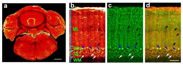 可視化大腦的組織結構是神經科學研究的基本需求。華中科技大學的付玲教授團隊展示了大視場二次諧波顯微成像能夠區分小腦和腦幹組織的分層和分區(下圖)。結合雙光子熒光成像和熒光標記轉基因GAD67小鼠,證實二次諧波顯微鏡具有細胞分辨水平,並在二次諧波圖像上可以分析獲取不同分層和亞區的神經元細胞密度。