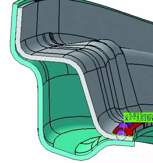 相對傳(chuan) 統工藝的點焊技術來說,激光飛行焊可以自定義(yi) 焊縫形式,優(you) 化焊縫焊後強度,增加了設計及工藝的靈活性,可以適用於(yu) 任何焊接形式、任何焊接方向。同時可以根據工藝要求自定義(yi) 焊縫分布,使得焊縫的受力最優(you) 化得以完美的實現。激光飛行焊的無接觸、靈活的焊縫要求,可使得焊接搭接麵更小。如圖6、圖7所示,傳(chuan) 統點焊為(wei) 保證焊點質量,避免出現騎邊焊等焊接缺陷,在產(chan) 品造型設計時要求其搭接邊最小≥11mm。而在我公司一款新型車型車門設計時采用激光飛行焊技術,焊接位置的最小搭接邊要求為(wei) ≤6mm。從(cong) 這個(ge) 角度分析,采用激光飛行焊可以在一定程度上減少材料成本和降低車身重量,在保證車身製造質量的基礎上最大限度的實現輕量化,亦達到節能減排的目的。