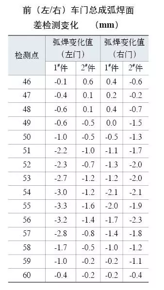 我公司某高端轎車車型在車門調試階段,對車門窗框部位的弧焊工藝焊後變形問題花費了近半年時間攻關。弧焊後車門變形量最大達到3mm,前門窗框總成50%~70%的部位弧焊變形量超過0.7mm以上(見圖1及附表),而後車門總成達到了80%~90%部位弧焊變形。在進行項目調試時需要花費較大的人力物力才把該問題控製在可接受範圍。