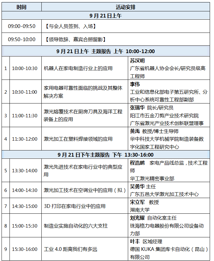 9月21日,由廣東(dong) 省激光行業(ye) 協會(hui) 與(yu) 《激光製造商情》主辦的“ALAT2017先進激光技術在家電產(chan) 業(ye) 中的應用研討會(hui) ”將在廣東(dong) 江門舉(ju) 辦,會(hui) 議邀請廣東(dong) 省機器人協會(hui) 、工業(ye) 和信息化部電子第五研究所、陽江市五金刀剪產(chan) 業(ye) 技術研究院、廣東(dong) 省激光產(chan) 業(ye) 技術創新聯盟、華中科技大學、廣東(dong) 五邑大學激光加工技術中心、華工激光等院校單位專(zhuan) 家與(yu) 研究院齊聚一堂,共同探討激光技術在家電中的應用。