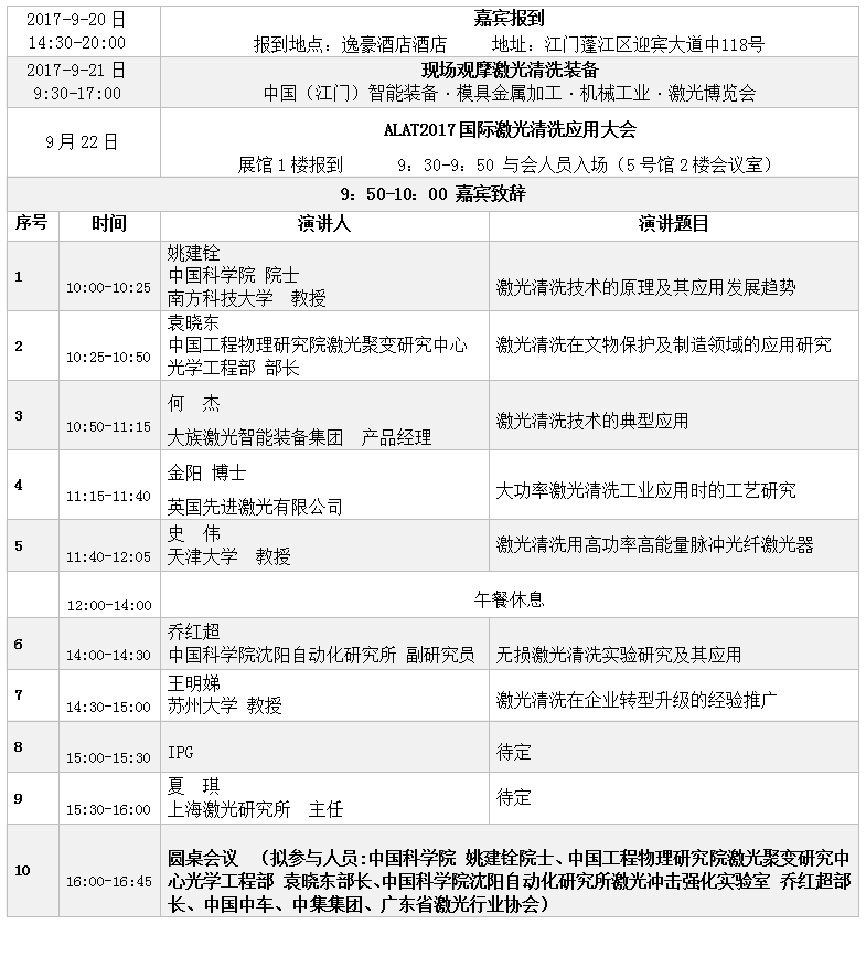 激光清洗是一種新型高效的環保清洗技術,是基於激光與物質相互作用效應的一項新技術,激光清洗具有無研磨、非接觸、無熱效應和適用於各種材質的物體等清洗特點,被認為是最可靠、最有效的解決辦法。與傳統的清洗方法不同,對人體和環境無害,是一種“綠色”清洗技術。現在眾多領域中逐步取代傳統清洗工藝,為了順應此時代發展,廣東省機器人協會、中國工程物理研究院激光聚變中心、廣東省激光行業協會、廣東省激光產業技術創新聯盟等將聯合舉辦“ALAT2017國際激光清洗技術大會”,此次大會將在江門廣東珠西國際會展中心召開。