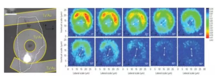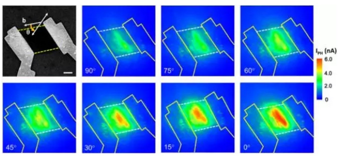 同年,斯坦福大學袁洪濤和崔屹等人將一塊黑磷薄片製作成上下垂直pn結,有效分離光生載流子,如圖3所示,同時製作一個環狀電極,消除電極/黑磷邊緣對偏振探測的幹擾。結果顯示黑磷具有明顯的偏振光敏感性。