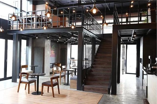 夾層采用碳鋼樓梯連接的咖啡廳