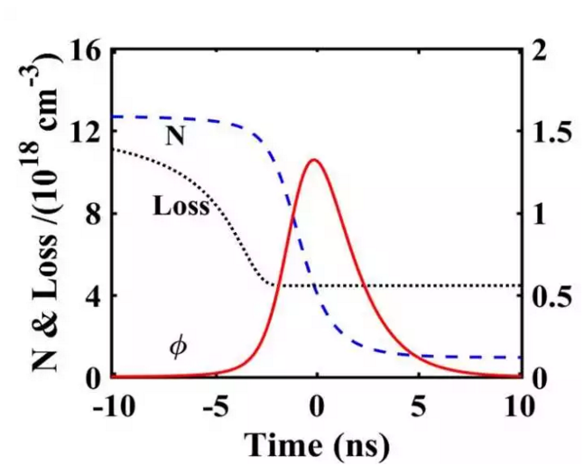 對於(yu) 脈衝(chong) 激光,峰值功率破萬(wan) 瓦是件輕鬆寫(xie) 意的事情。一個(ge) 調Q激光,脈衝(chong) 寬度在納秒量級,脈衝(chong) 能量在亞(ya) 毫焦量級,峰值功率可以達到萬(wan) 瓦,而成本可以低於(yu) 2萬(wan) 毛爺爺。簡要介紹下調Q原理,下圖是數值求解速率方程得到的調Q脈衝(chong) 的演化過程。從(cong) 激光原理的角度解釋這件事情有點麻煩。我就比喻一下。好比一個(ge) 人喝水,如果一個(ge) 人大小便失禁,每喝一口水就立即尿出來,那麽(me) 他的尿的流速可以認為(wei) 等於(yu) 喝水的速度。如果這個(ge) 人看了廣告吃了腎寶片,腎功能異常強大,上午喝了一桶水,憋到了下午,那他解開褲子的一刹那將一瀉千裏。連續激光類似大小便失禁,釋放能量的速率即功率約為(wei) 吸收能量的速率,調Q激光類似憋尿,吸收大量能量後瞬間釋放出來,功率也就顯著高於(yu) 連續激光。然而調Q激光的最高峰值功率在兆瓦量級,顯然不能滿足人們(men) 貪婪的胃口。