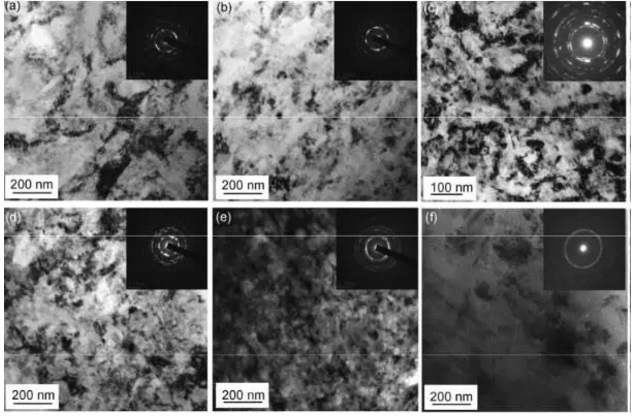 鈦合金激光衝(chong) 擊在表層產(chan) 生的納米晶層厚度約1 μm,晶粒尺寸分布為(wei) 30-300 nm;鎳基高溫合金形成的納米晶層厚度為(wei) 0.5-1 m,晶粒尺寸範圍為(wei) 30-500 nm;衝(chong) 擊1次表麵納米晶分布還不均勻(圖1(a)-(c)),衝(chong) 擊3-5次後,在多種金屬材料表麵形成了取向隨機、等軸狀的納米晶(圖1(d)-(f))。從(cong) 不同金屬材料激光衝(chong) 擊表麵納米化過程與(yu) 特征來看,晶粒細化機製主要取決(jue) 於(yu) 材料本身的結構與(yu) 衝(chong) 擊波參數。