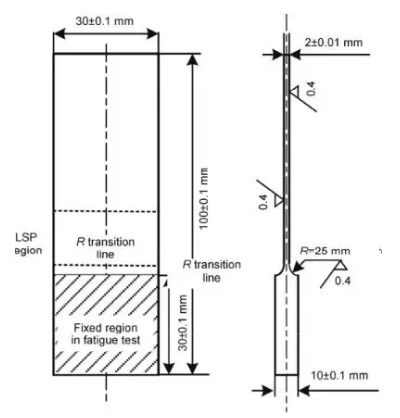以TC17鈦合金為(wei) 研究對象,設計了模擬薄葉片的振動疲勞樣件,葉片厚度為(wei) 1 mm,衝(chong) 擊區域及樣品尺寸,如圖3所示。