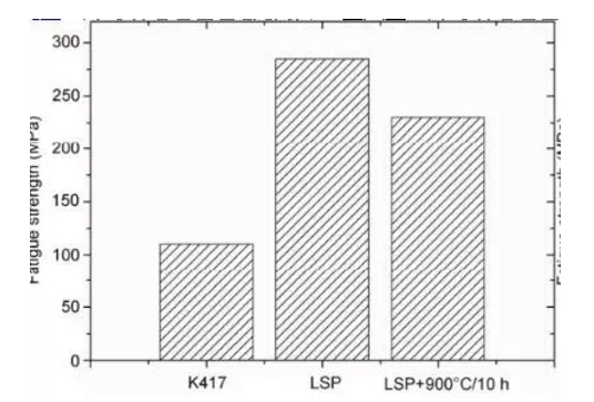 圖7和8分別為(wei) 標準振動疲勞樣件尺寸和疲勞結果。選用的激光衝(chong) 擊參數為(wei) :激光能量10.8 J,脈寬20 ns,光斑直徑3.4 mm,搭接率為(wei) 60%,衝(chong) 擊1次。可看到,原始K417試片的疲勞強度為(wei) 110 MPa,激光衝(chong) 擊強化後提高至285 MPa,900°C/10h熱處理後疲勞強度為(wei) 230 MPa,相對未處理的試片仍提高了1.1倍。熱處理未明顯降低激光衝(chong) 擊強化的效果。