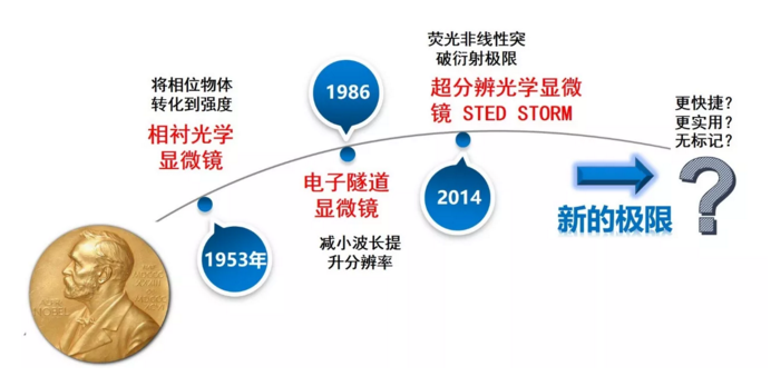 2014年諾貝爾化學獎頒給了Stefan W. Hell,Eric Betzig 和 William E. Moerner,以表彰他們發明的受激發射損耗顯微成像(Stimulated Emission Depletion(STED)microscopy)和單分子顯微成像(Single-molecule Microscopy)將熒光顯微鏡的分辨率提高到了納米量級,為生物和醫學的發展提供了有力的研究手段。這些技術首先利用特殊的熒光顆粒對生物組織進行染色標記,然後通過使用熒光顆粒的非線性效應而將距離很近的結構分辨開來。但同時,基於熒光標記樣品的成像方法對熒光顆粒和成像樣品都有著較為嚴格的要求,普適性不強,且遇到了成像速度慢、易引起生物體排異反應等瓶頸。所需要的顯微係統昂貴而複雜。