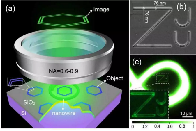 該方法是一種片上移頻顯微術,整個結構集成在一片毫米量級厚,厘米量級寬的矽片上,將之放入普通顯微係統代替傳統的載玻片,隻需要激發片上的納米線光源發出熒光,即可使普通顯微鏡具備超分辨能力,實現從傳統顯微鏡到超分辨顯微鏡的飛躍提升。結構如圖2 (a)所示。圖2(b)為利用該方法觀察特征尺寸在幾十納米量級的“ZJU”圖案效果。