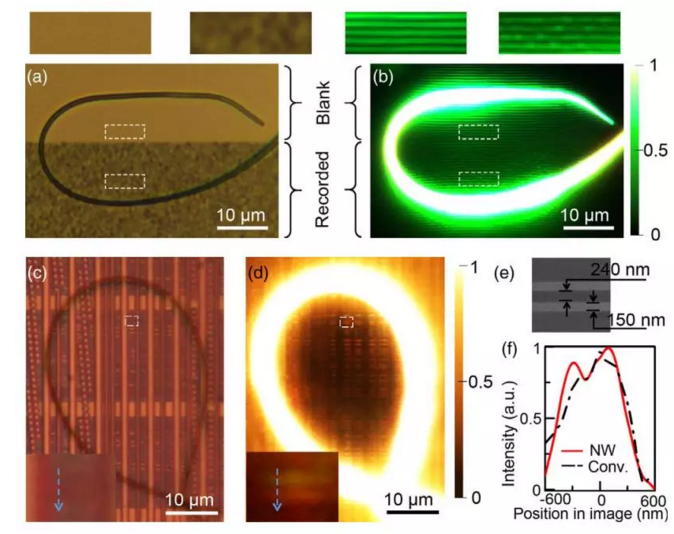 圖3 NWRIM在藍光光碟和集成電路上的應用效果圖。(a) 藍光光碟的普通顯微成像;(b) 藍光光碟在納米線環照明下的成像;(c) 集成電路的普通顯微成像;(d) 集成電路在納米線環照明下的成像;(e) 子圖(c)與(d)中白色方框標示區域的電子顯微鏡照片;(f)子圖(c)與(d)中沿藍色虛線所描繪的成像強度分布。