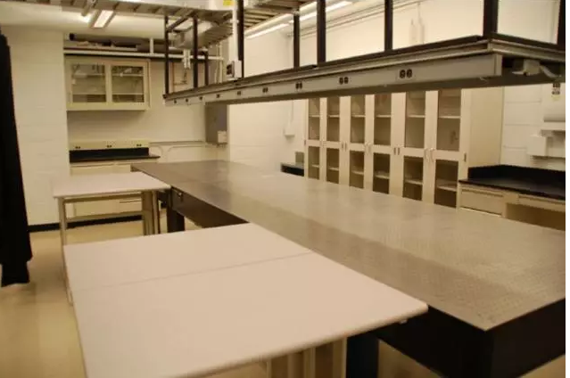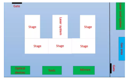 首先來看看比較常見的E字形布局,參觀的很多光學實驗室也都是基於此類布置。這種布置方式的優點是整體性好,各個光學平台可以連接成一個整體。在工程師將其整體調節水平後,即可方便地開展實驗,兩邊的凹槽也方便人員走動,且各個平台相對激光器的距離較近。避免了激光在空氣中長距離傳播而影響光束品質。