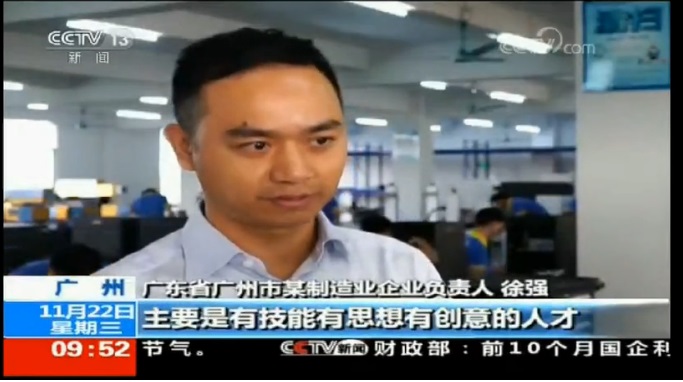 ”為(wei) 解決(jue) 技師學院學生就業(ye) 問題,提高就業(ye) 收入,也為(wei) 我司帶來高新技術人才;2015年我司已與(yu) 廣東(dong) 省機械技師學院創建了校企合作班“,創可激光負責人徐強在接受央視采訪時提到。“我們(men) 現在所需要的人才,主要是有技能有思想有創意的人才,解決(jue) 了人才問題,其他都是小事”。