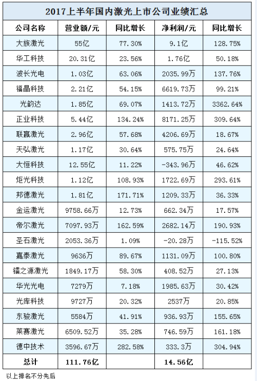 根據Laser Manufacture News發布的相關(guan) 數據,2017年上半年國內(nei) 已上市激光企業(ye) 營收規模超20億(yi) 元的,有大族激光、華工科技兩(liang) 家。大族激光收入接近55億(yi) 元,華工科技收則在20.31億(yi) 左右。(數據來源2017上半年各公司財報)